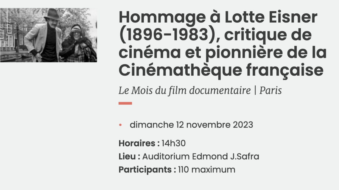 12 novembre : Lotte Eisner : rencontre au Mémorial de la Shoah 21 octobre 2023 – Publié dans : Événements – Étiquettes: lotte eisner