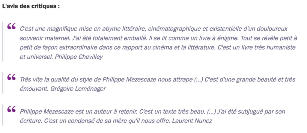 « Le film rétablit mon enfance défaite, c’est un prodige dont je savoure toute la délicatesse », écrit Philippe Mezescaze dans ce beau livre, lui aussi d’une délicatesse rare. L’article est disponible ici : Philippe Mezescaze : l’enfance retrouvée grâce au cinéma