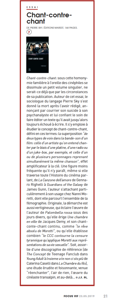La force de chant-contre-chant réside dans le déploiement d’une pensée vive et mouvante, qui saute allégrement d’une image à une autre pour creuser ses intuitions sans jamais perdre le fil. Le style est brillant et toujours porté par un profond amour du cinéma, notamment dans sa dimension « populaire ». L’article est consultable ici : http://drorlof.over-blog.com/2019/04/besoin-de-consolation.html