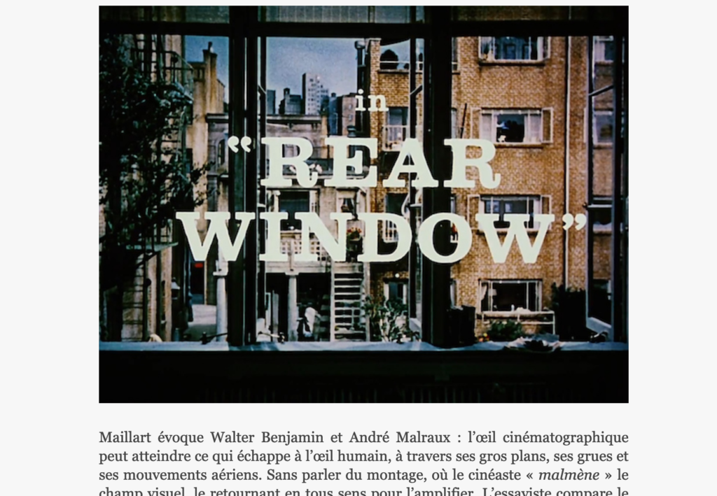 L’essai – passionnant – d’Olivier Maillart suscite de nombreuses réflexions de ce genre, invitant son lecteur à se mettre devant un écran de cinéma afin de le scruter attentivement. Et d’être scruté ? Steven Sampson a lu et a aimé Énigmes, cinéma : https://www.en-attendant-nadeau.fr/2019/04/09/cinema-decryptage-maillart/