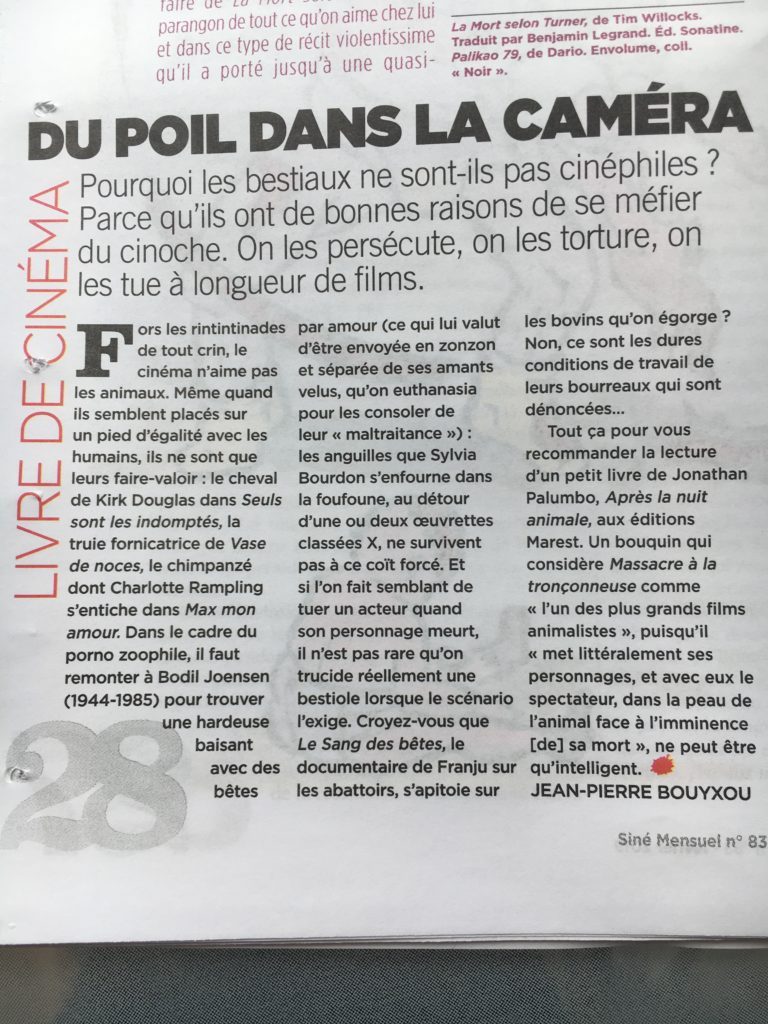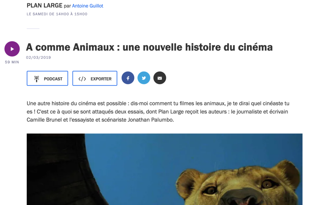 Jonathan Palumbo (Après la nuit animale) et Camille Brunel (Le Cinéma des animaux) étaient les invités de l’émission Plan large, animée par Antoine Guillot. L’émission est en écoute sur ce lien : Sur France Culture : « A comme Animaux : une nouvelle histoire du cinéma »