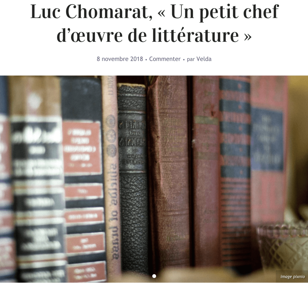 Le lecteur rebondit de trait d’humour en remarque vacharde et toujours bien vue, et termine le livre tout essoufflé, secoué qu’il est par une littérature telle qu’on en écrit trop peu. Merci Luc Chomarat… A nous de remercier Catherine/Velda et Addict-Culture ! https://addict-culture.com/luc-chomarat-un-petit-chef-doeuvre-de-litterature/