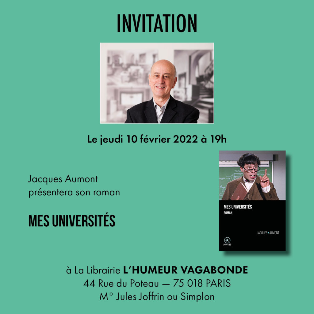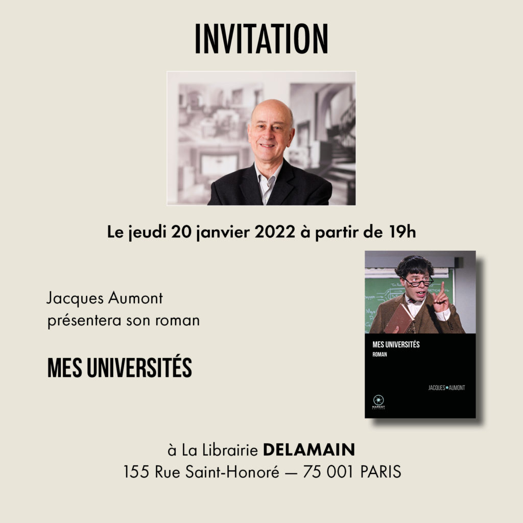 Le jeudi 20 janvier à 19 heures, lancement des mémoires de Jacques Aumont, Mes universités, à la librairie Delamain, 155 rue Saint-Honoré, Paris 1er.
