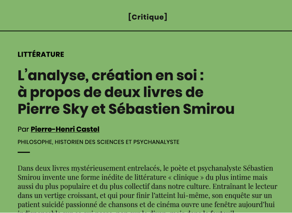 Le chant-contre-chant a tout simplement l’air d’être la façon dont Sébastien Smirou, psychanalyste, s’écoute écouter, se laisse pénétrer de la bande-son du patient dans le film mental qu’il déroule en associant sur ces associations ; et tout ce qu’en dit Pierre Sky dans le style brillant de l’essai critique paraît aimanté par une vérité qu’il n’est […]